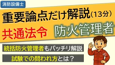 消防法【合格解法】共通法令(全類共通)|令和8年2月上旬 【合格解法】共通法令(全類共通)|令和8年2月上旬 #1こんにちは。新千歳防災チャンネルです。消防設備士試験「新千歳防災チャンネルの合格解法」。令和8年2月上旬に実施された本試験を... 2026.02.10消防法消防設備士資格試験
